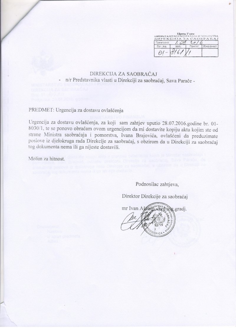 Parača je, kako navodi Ašanin, odbio službeni nalog da dostavi ovlašćenje ministra saobraćaja i pomorstva Ivana Brajovića da preuzme poslove iz djelokruga rada Direkcije nakon što je primio zahtjev za dostavu ovlašćenja.